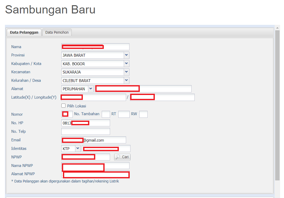 Isi data diri antara lain nama pemohon, email aktif, id pelanggan .